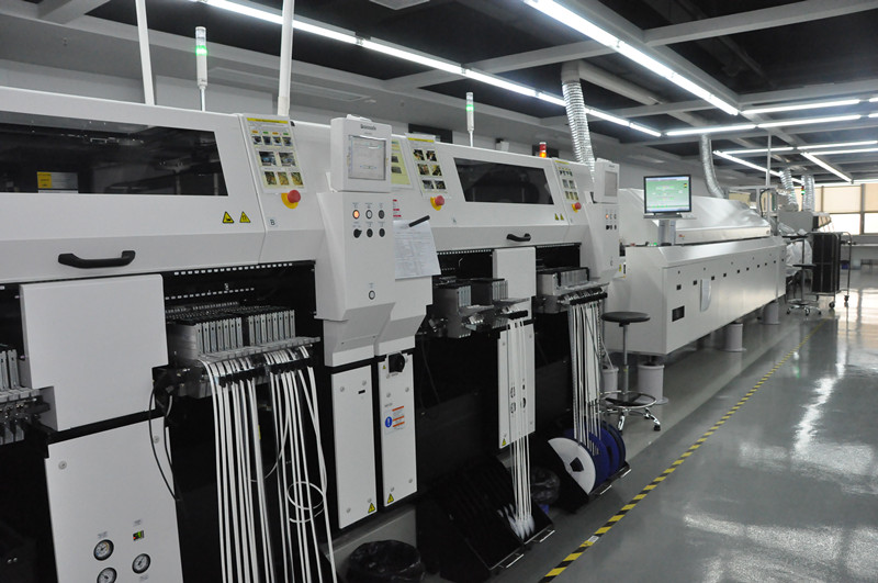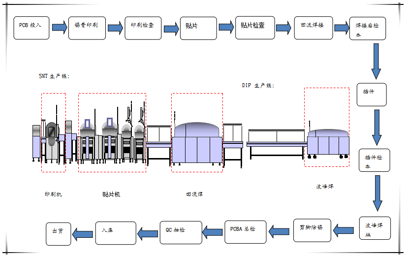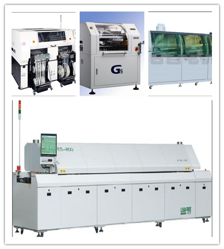貼片車間生產(chǎn)線目前有1條SMT(表面封裝焊接技術(shù))與DIP(通孔封裝焊接技術(shù))組成。其中SMT設(shè)備有全自動上板機1臺,全自動傳送接駁設(shè)備3臺,GKG全自動印刷機1臺,Panasonic-AM100高速貼片機2臺,JTE全自動熱風(fēng)回流焊爐1臺,錫膏攪拌機1臺及全自動烘箱1臺組成;DIP設(shè)備有全自動插件線2條,日東全自動波峰焊接爐1臺,全自動出板接駁設(shè)備1臺,電容成型機1臺及電阻成型機1臺;周邊輔助設(shè)備空壓機1臺,冷干機1臺及風(fēng)機1臺。